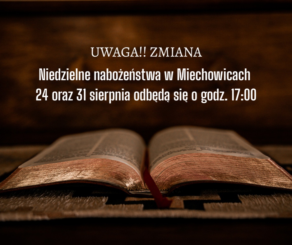 Nabożeństwa 24 i 31 sierpnia o godz: 17:00 W dniach 24 oraz 31 sierpnia zapraszamy na nabożeństwa o godz: 17:00